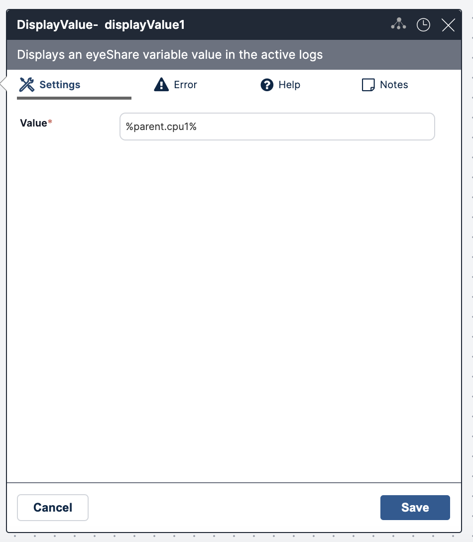 For example, the child workflow may have an activity DisplayValue. In this activity, you may write %cpu1% in the Value field.