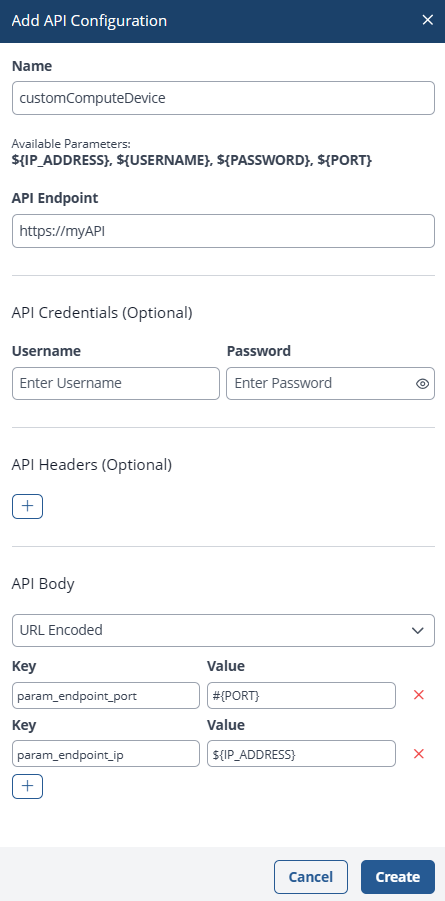 API (for API configuration type): Enter the API endpoint details. This configuration can support multiple device types of the API allows it, but only one endpoint can be used per configuration. Fill in the following fields: